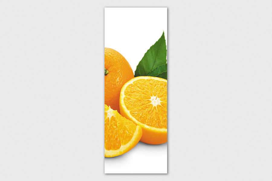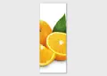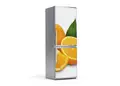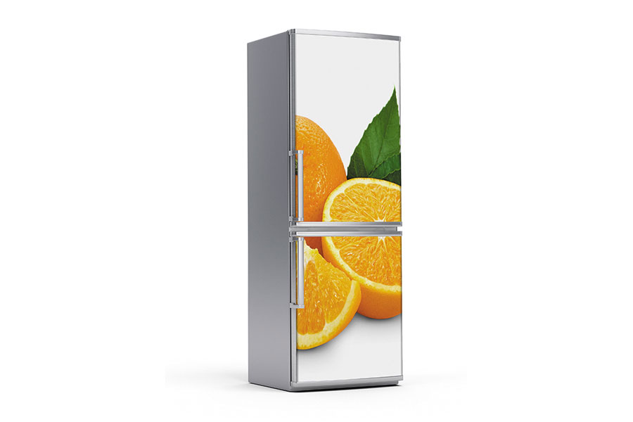 Υφασμάτινο αυτοκόλλητο ψυγείου που απεικονίζει πορτοκάλια, ολόκληρο, κομμένο στη μέση και μια φέτα από πορτοκάλι.