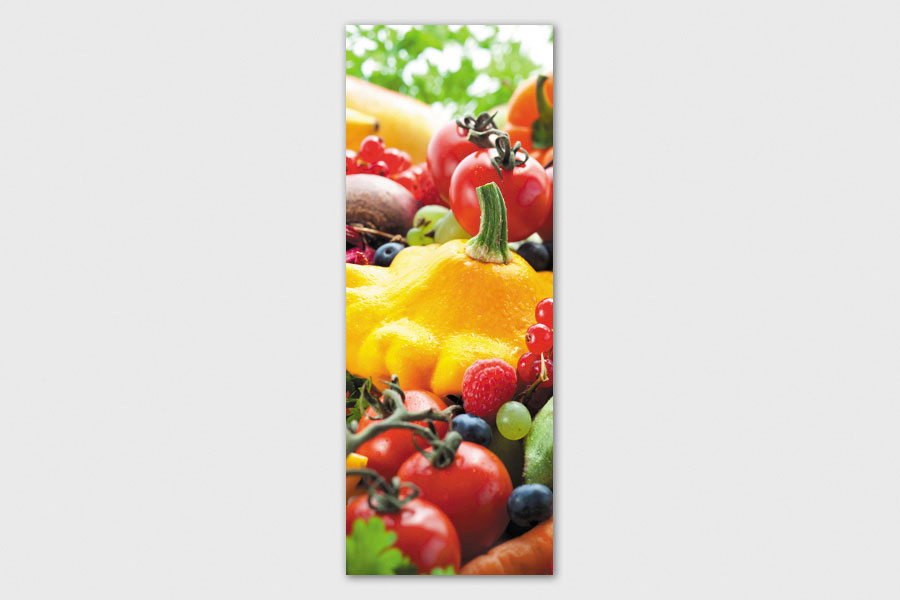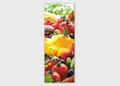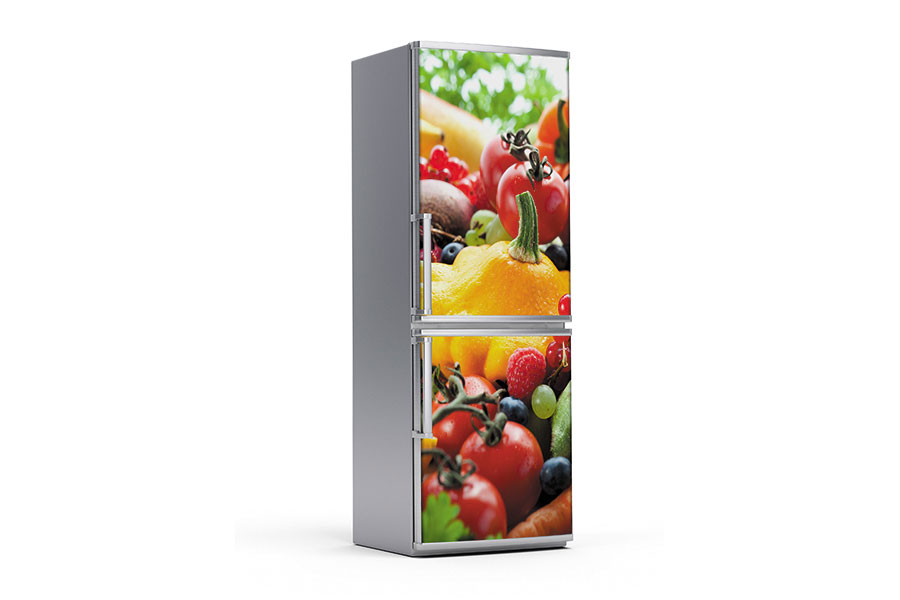 Υφασμάτινο αυτοκόλλητο ψυγείου που απεικονίζει διάφορα λαχανικά και φρούτα.