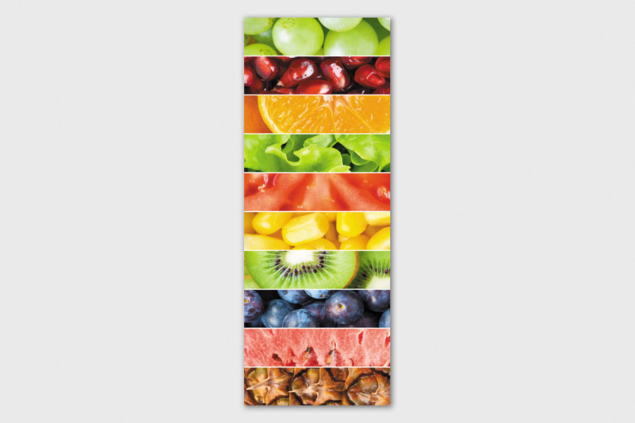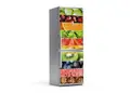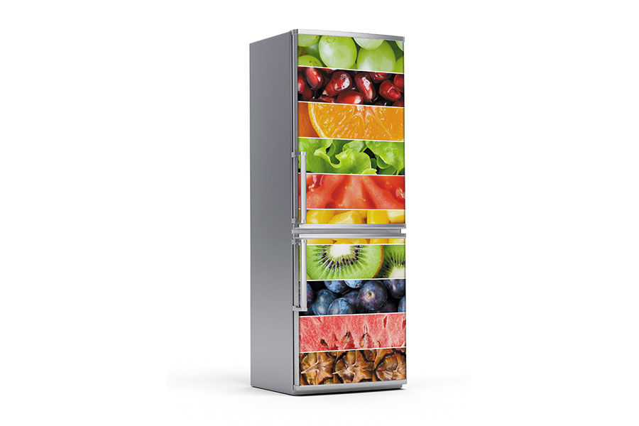 Υφασμάτινο αυτοκόλλητο ψυγείου που απεικονίζει λωρίδες με εικόνες από διάφορα λαχανικά και φρούτα.