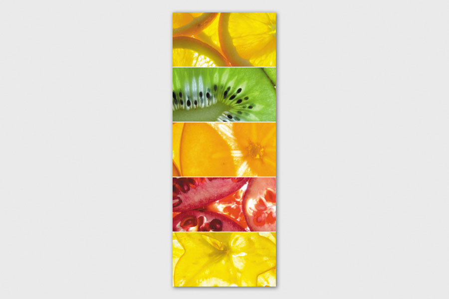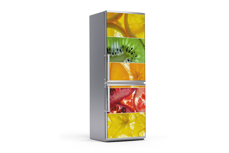 Υφασμάτινο αυτοκόλλητο ψυγείου που απεικονίζει λωρίδες με εικόνες από διάφορα φρούτα.