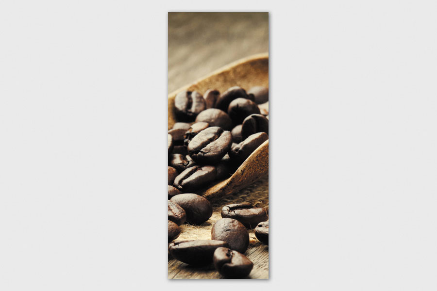 Υφασμάτινο αυτοκόλλητο ψυγείου που απεικονίζει ακατέργαστους κόκκους καφέ σε μια ξύλινη σέσουλα.