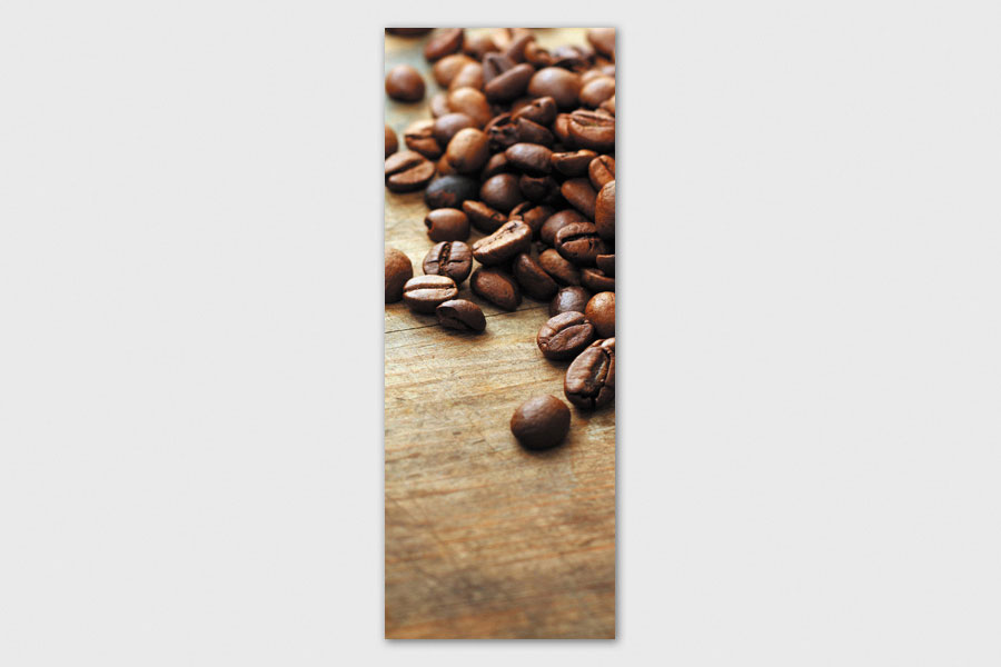 Υφασμάτινο αυτοκόλλητο ψυγείου που απεικονίζει ακατέργαστους κόκκους καφέ πάνω σε μια ξύλινη επιφάνεια.