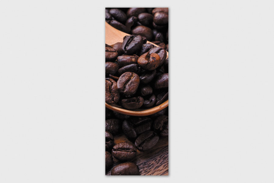 Υφασμάτινο αυτοκόλλητο ψυγείου που απεικονίζει ακατέργαστους κόκκους καφέμαζί με ένα ξύλινο κουτάλι πάνω σε μια ξύλινη επιφάνεια.