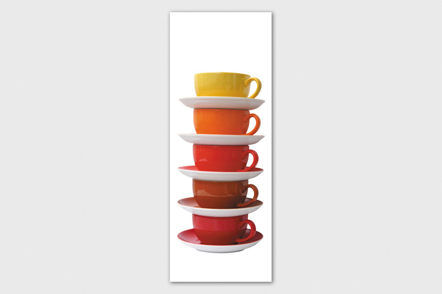 Υφασμάτινο αυτοκόλλητο ψυγείου που απεικονίζει πέντε κούπες με πιατάκια η μία πάνω στην άλλη σε αποχρώσεις κόκκινου, πορτοκαλί και κίτρινου.