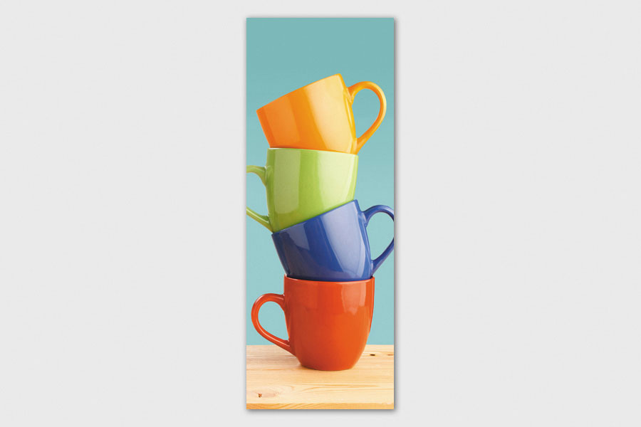 Υφασμάτινο αυτοκόλλητο ψυγείου που απεικονίζει τέσσερις κούπες η μία μέσα στην άλλη σε διάφορα χρώματα και πάνω σε ξύλινη επιφάνεια.