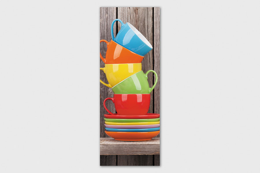 Υφασμάτινο αυτοκόλλητο ψυγείου που απεικονίζει πέντε κούπες με πιατάκια το ένα πάνω στο άλλο σε διάφορα χρώματα και μπροστά από ξύλινο φόντο.