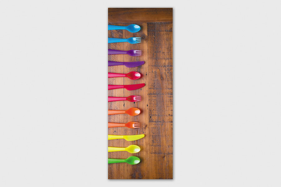 Υφασμάτινο αυτοκόλλητο ψυγείου που απεικονίζει πλαστικά μαχαίρια, πιρούνια και κουτάλια σε έντονα χρώματα πάνω σε ξύλινη επιφάνεια .