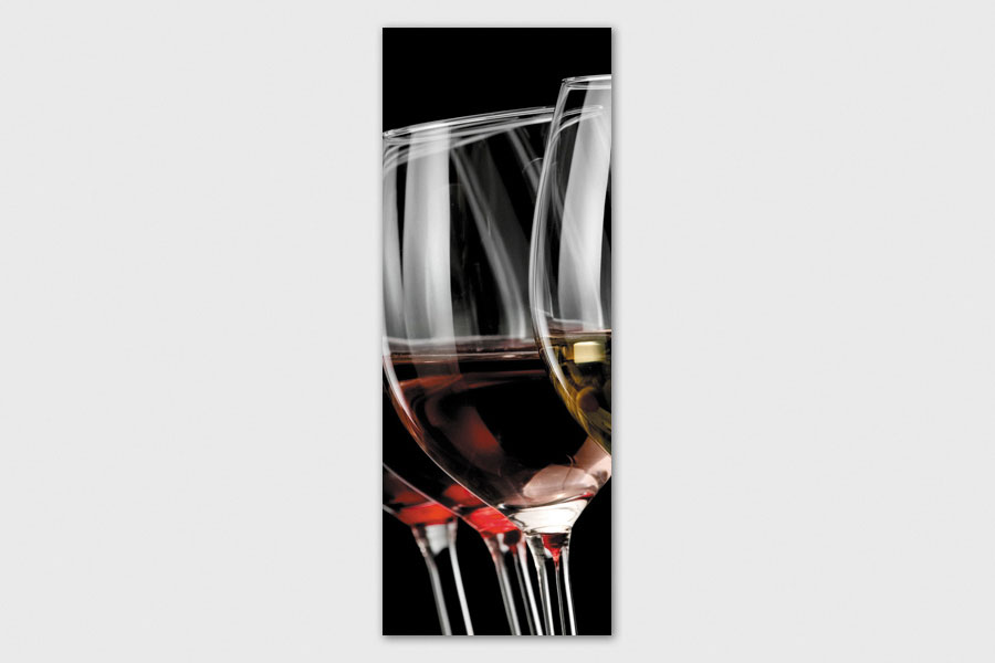 Υφασμάτινο αυτοκόλλητο ψυγείου που απεικονίζει τέσσερα ποτήρια με λευκό, ροζέ και κόκκινο κρασί σε σκούρο φόντο.