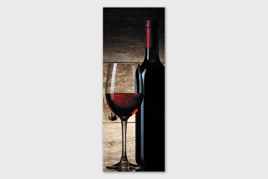 Υφασμάτινο αυτοκόλλητο ψυγείου που απεικονίζει ένα ποτήρι και ένα μπουκάλι με κόκκινο κρασί σε σκούρο φόντο.