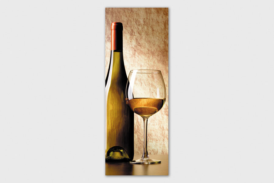 Υφασμάτινο αυτοκόλλητο ψυγείου που απεικονίζει ένα ποτήρι και ένα μπουκάλι με λευκό κρασί σε σκούρο φόντο.