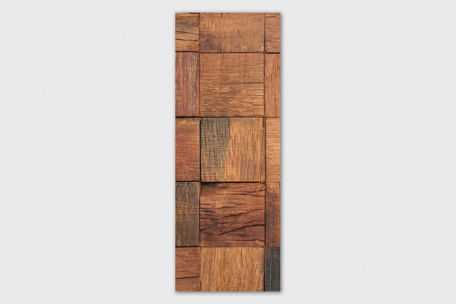 Υφασμάτινο αυτοκόλλητο ψυγείου που απεικονίζει τετράγωνα κομμάτια ξύλου από διάφορους κορμούς.