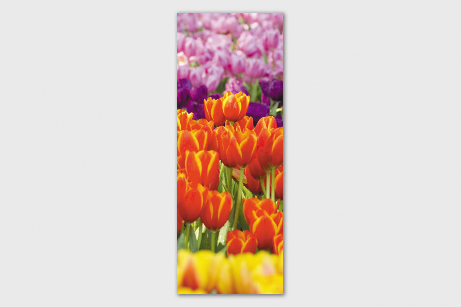 Υφασμάτινο αυτοκόλλητο ψυγείου που απεικονίζει τουλίπες σε διάφορα χρώματα.