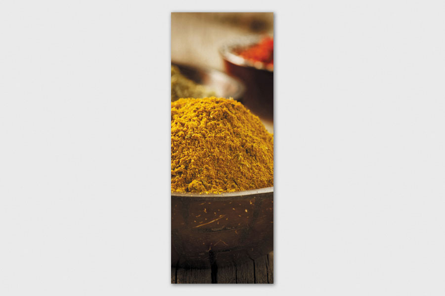 Υφασμάτινο αυτοκόλλητο ψυγείου που απεικονίζει μπολ με διάφορα μπαχαρικά σε σκούρα χρώματα.