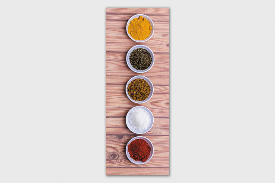 Υφασμάτινο αυτοκόλλητο ψυγείου που απεικονίζει 5 λευκά μπολ με διάφορα μπαχαρικά σε όψη από πάνω.