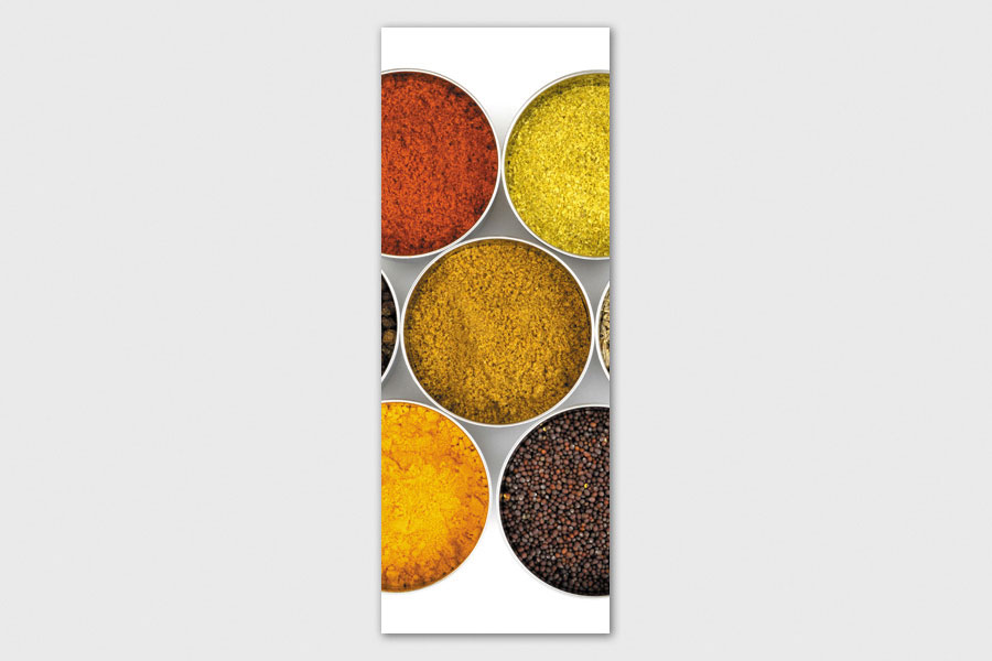 Υφασμάτινο αυτοκόλλητο ψυγείου που απεικονίζει μπολ με διάφορα μπαχαρικά σε όψη από πάνω.