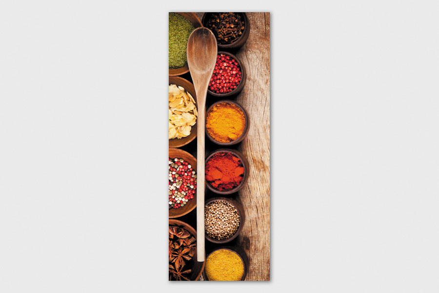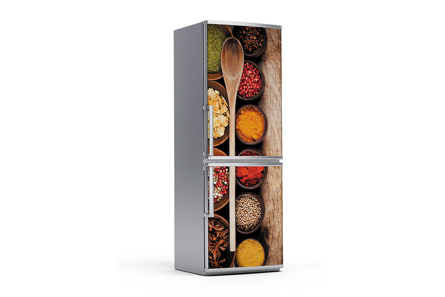 Υφασμάτινο αυτοκόλλητο ψυγείου που απεικονίζει μπολ με διάφορα μπαχαρικά σε σκούρα χρώματα και πάνω τους μια ξύλινη κουτάλα, σε όψη από πάνω.