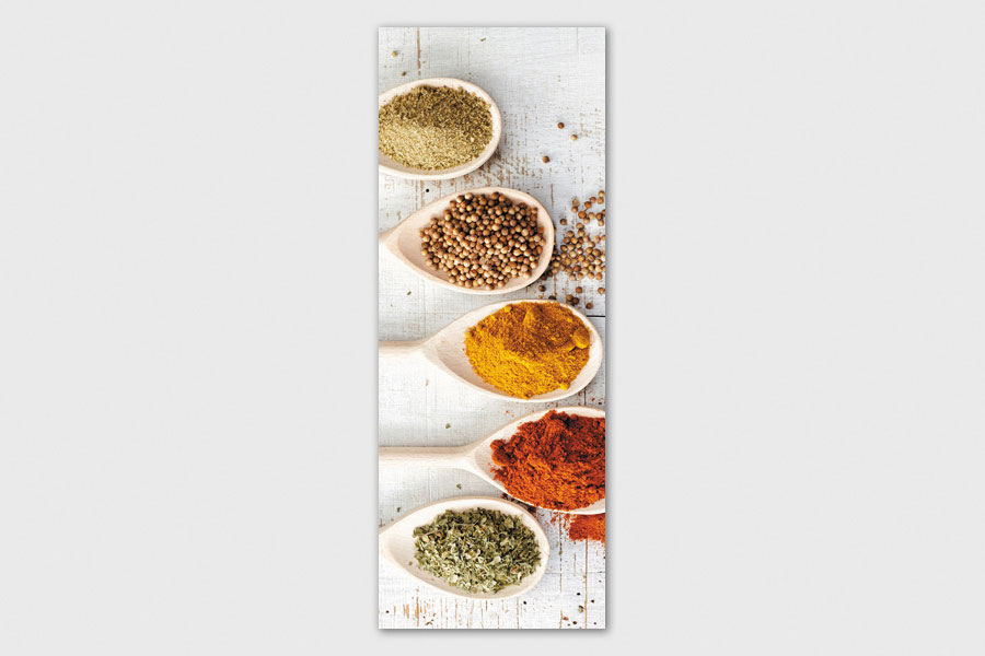 Υφασμάτινο αυτοκόλλητο ψυγείου που απεικονίζει 5 λευκά κουτάλια, με διάφορα μπαχαρικά σε όψη από πάνω.