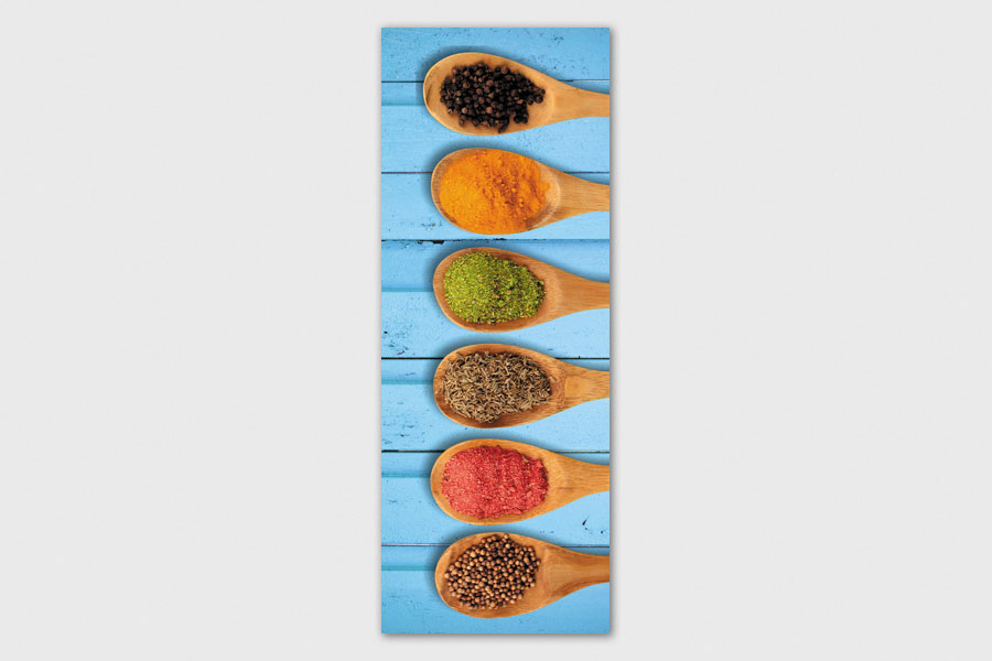 Υφασμάτινο αυτοκόλλητο ψυγείου που απεικονίζει 6 ξύλινα κουτάλια, με διάφορα μπαχαρικά σε όψη από πάνω και σε γαλάζιο ξύλινο φόντο.