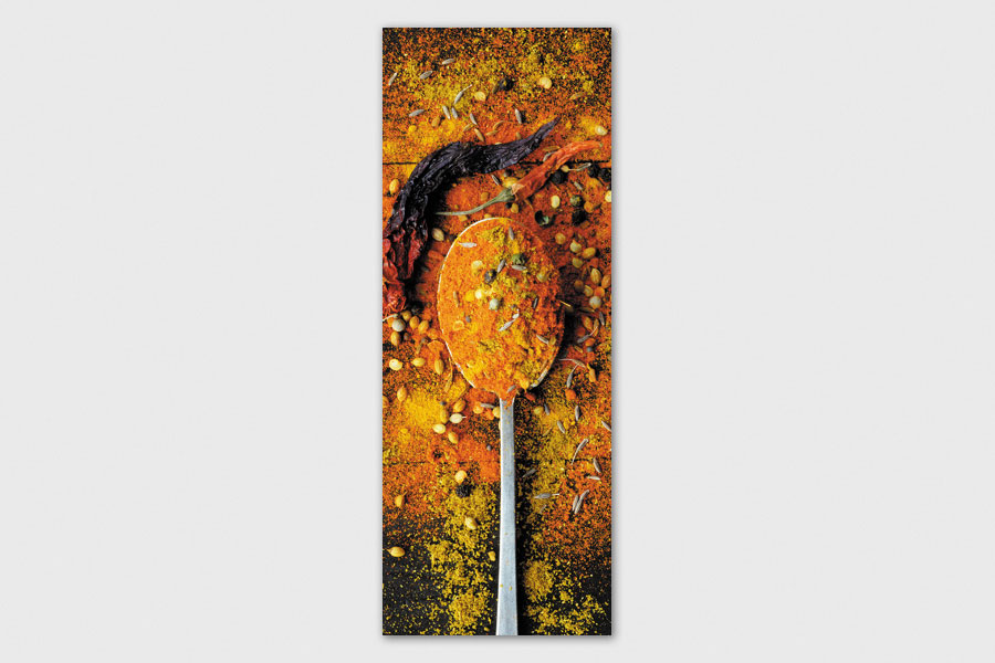 Υφασμάτινο αυτοκόλλητο ψυγείου που απεικονίζει διάφορα μπαχαρικά σε ξύλινη επιφάνεια με ένα μεταλικό κουτάλι στη μέση.