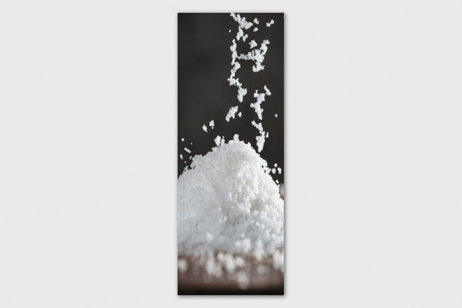 Υφασμάτινο αυτοκόλλητο ψυγείου που απεικονίζει χοντρό αλάτι σε ξύλινη επιφάνεια.