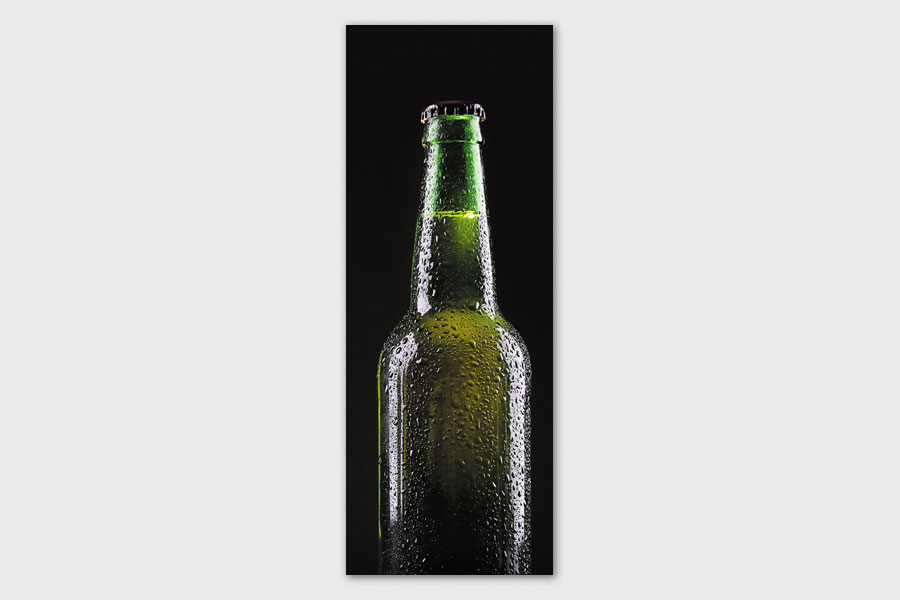Υφασμάτινο αυτοκόλλητο ψυγείου που απεικονίζει ένα πράσινο μπουκάλι μπύρα σε μαύρο φόντο.