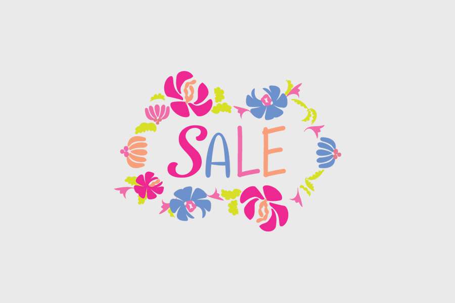 Αυτοκόλλητο βιτρίνας από βινύλιο που απεικονίζει μια μπορντούρα με λουλούδια σε οπάλ χρώματα, γύρω από τη λέξη "SALE".