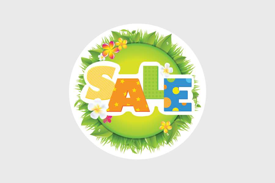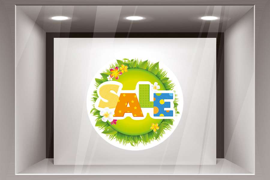 Αυτοκόλλητο βιτρίνας από βινύλιο που απεικονίζει μια κυκλική σύνθεση με πρασινάδα και λουλούδια και τη λέξη "SALE" στη μέση σε διάφορα χρώματα και λευκό περίγραμμα.