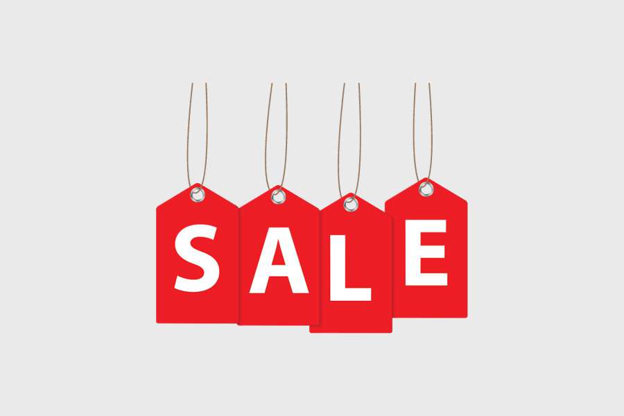 Αυτοκόλλητο βιτρίνας από βινύλιο που απεικονίζει τέσσερα καρτελάκια τιμών σε κόκκινο χρώμα όπου κάθε ένα περιέχει ένα γράμμα από τη λέξη "SALE" σε λευκό χρώμα.