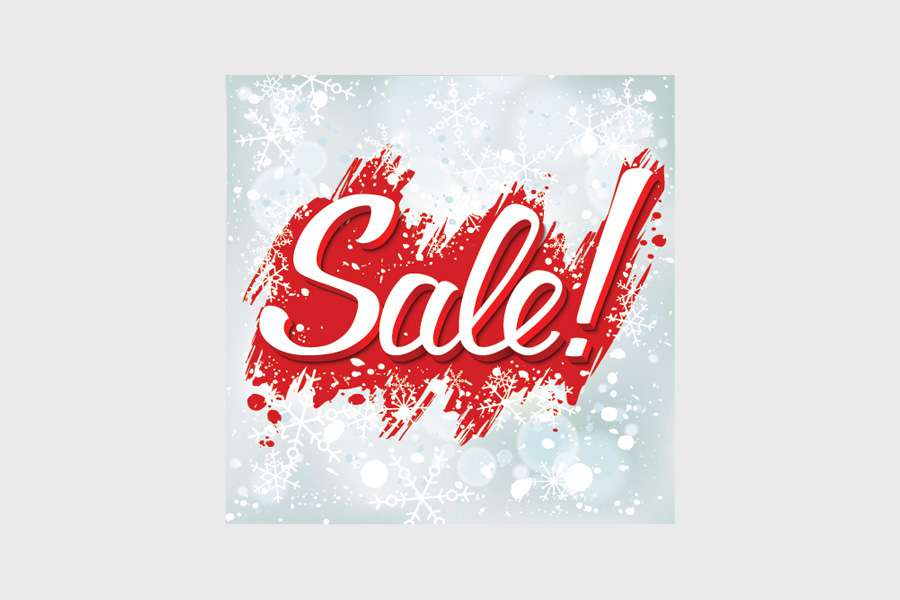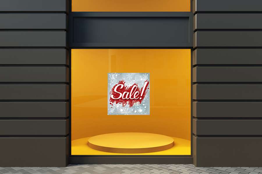 Αυτοκόλλητο βιτρίνας από βινύλιο που απεικονίζει μια σύνθεση από γραφικά που παραπέμπουν σε χειμώνα ή γιορτές με τη φράση "Sale!" σε κόκκινο φόντο.