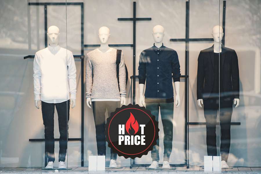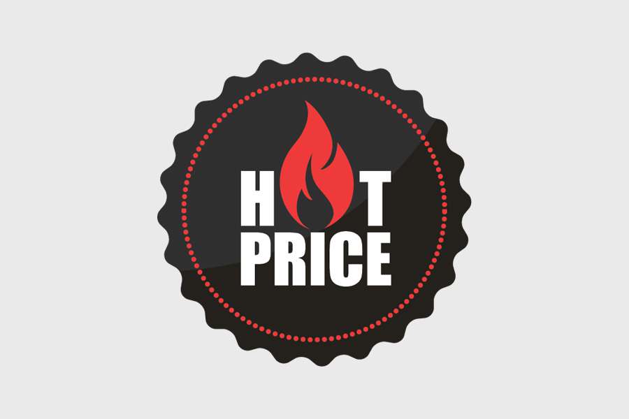 Αυτοκόλλητο βιτρίνας από βινύλιο που απεικονίζει ένα μαύρο αυτοκόλλητο με μπορντούρα από κόκκινες τελείες και τη φράση "HOT PRICE" με λευκά γράμματα και μια κόκκινη φλόγα στη θέση του O.