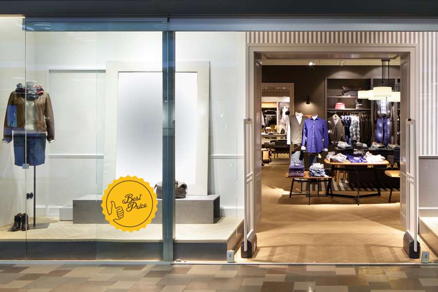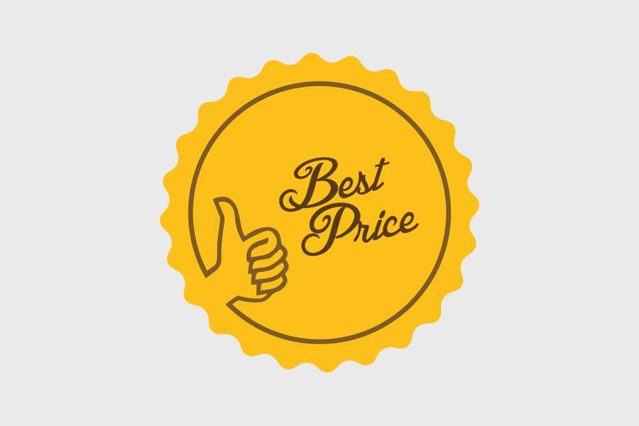 Αυτοκόλλητο βιτρίνας από βινύλιο που απεικονίζει ένα κίτρινο αυτοκόλλητο με μπορντούρα από μια καφέ γραμμή και τη φράση "Best Price" με καφέ γράμματα.