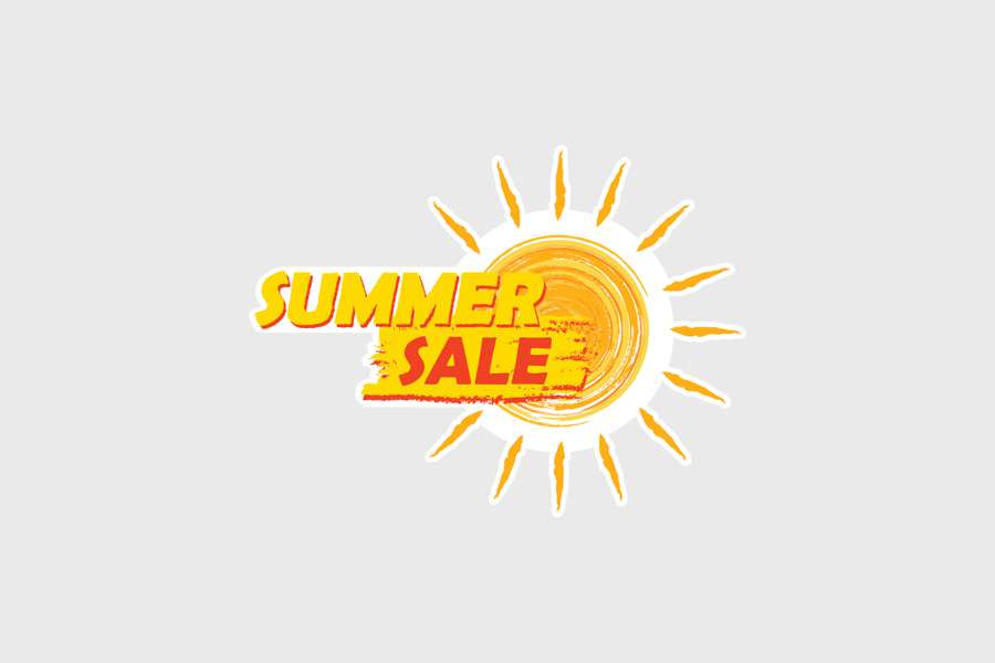 Αυτοκόλλητο βιτρίνας από βινύλιο που απεικονίζει έναν ήλιο με ακτίνες και τη φράση "SUMMER SALE" και όλα μαζί σε λευκό περίγραμμα.