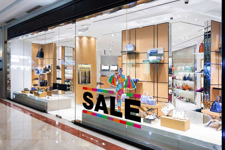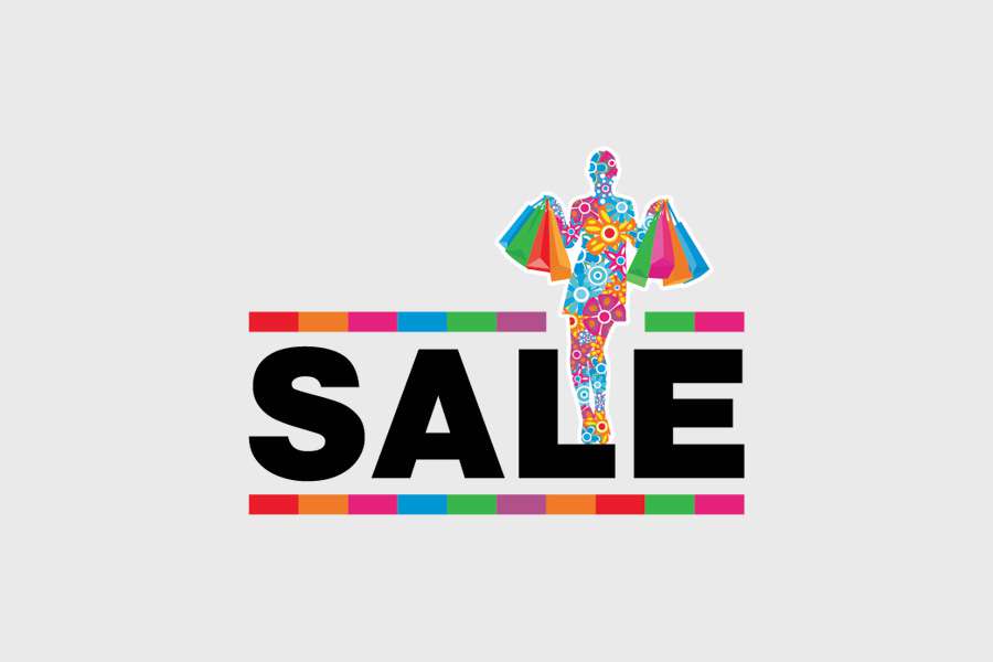 Αυτοκόλλητο βιτρίνας από βινύλιο που απεικονίζει χρωματιστές παράλληλες γραμμές που αναμέσα τους υπάρχει η λέξη "SALE". Στην μια πλευρά υπάρχει ένα γραφικό από μια κοπέλα με τσάντες καταστημάτων που είναι σε διάφορα χρώματα και με διάφορα λουλούδια.