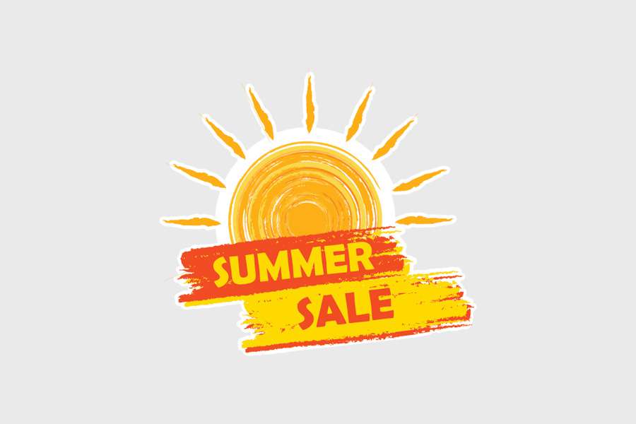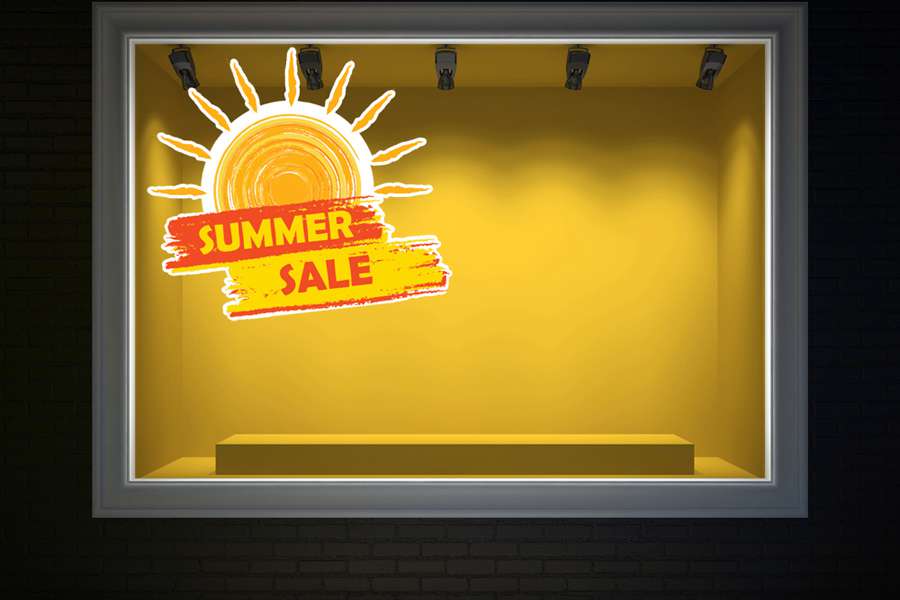 Αυτοκόλλητο βιτρίνας από βινύλιο που απεικονίζει έναν ήλιο με ακτίνες και τη φράση "SUMMER SALE" και όλα μαζί σε λευκό περίγραμμα.