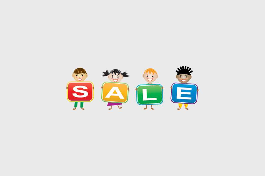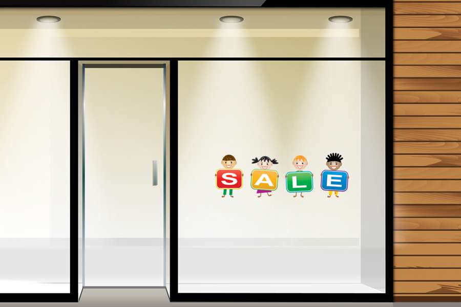 Αυτοκόλλητο βιτρίνας από βινύλιο που απεικονίζει τέσσερα παιδάκια που κρατάνε πινακίδες που μέσα τους κάθε μια έχει ένα γράμμα από τη λέξη "SALE".