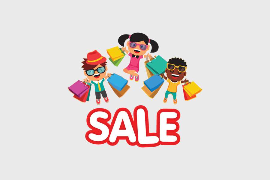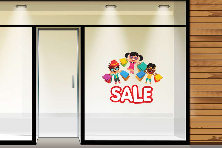 Αυτοκόλλητο βιτρίνας από βινύλιο που απεικονίζει τρία παιδάκια που κρατάνε τσάντες καταστημάτων πάνω από τη λέξη "SALE" σε λευκό χρώμα με κόκκινο περίγραμμα.