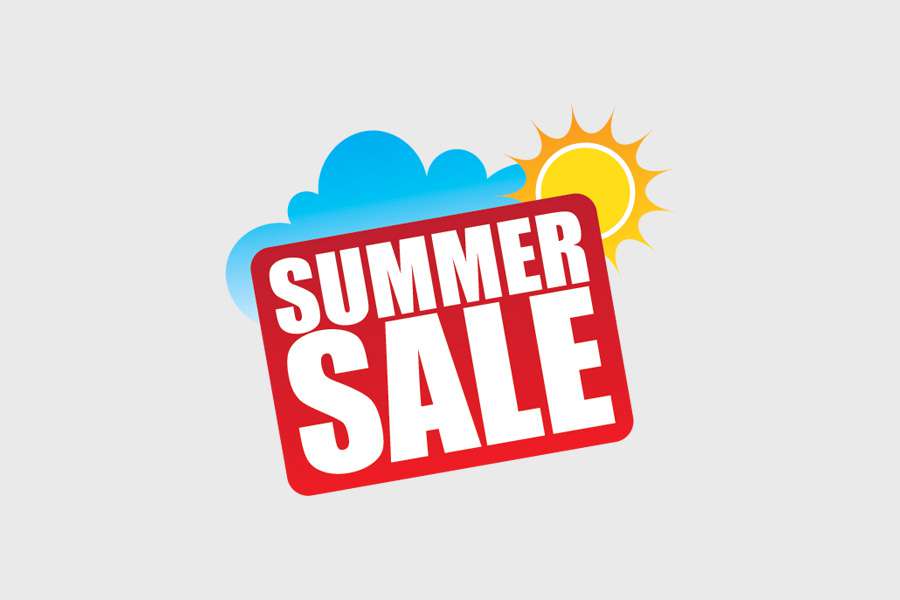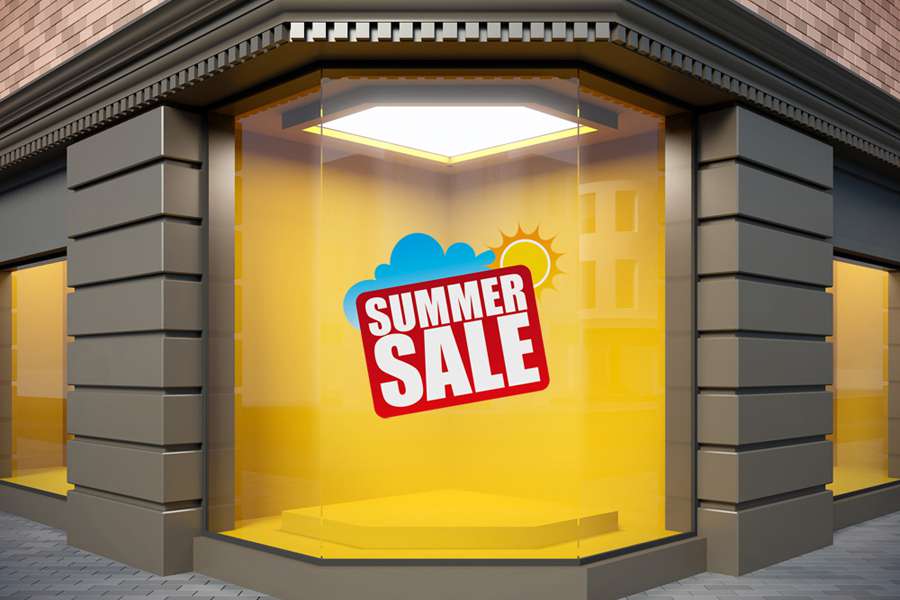 Αυτοκόλλητο βιτρίνας από βινύλιο που απεικονίζει ένα κόκκινο πλαίσιο μπροστά από ένα σύννεφο και έναν ήλιο. Μέσα στο πλαίσιο υπάρχει η φράση "SUMMER SALE" σε λευκό χρώμα.