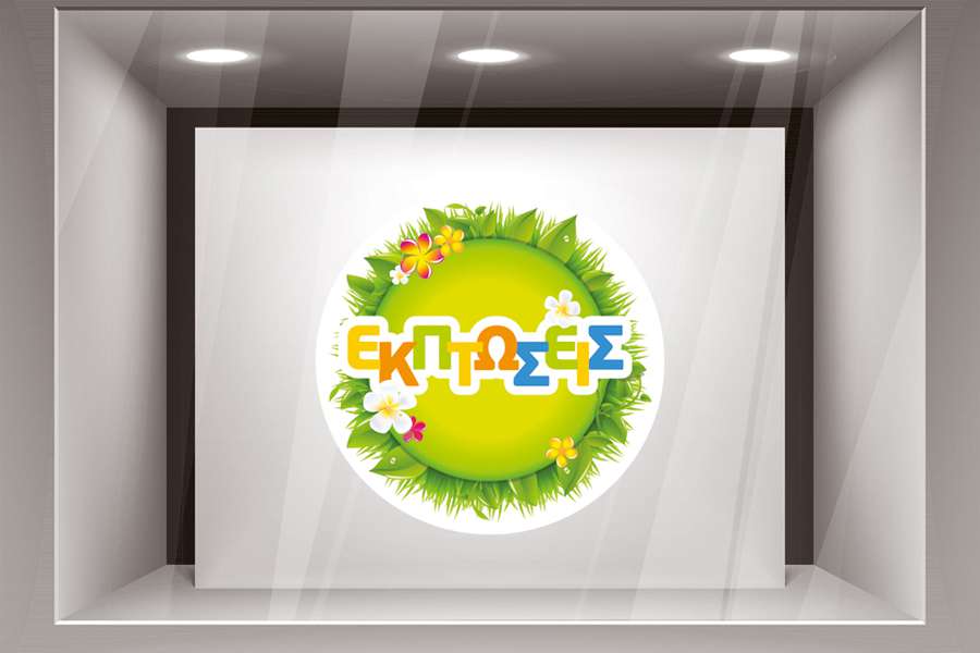 Αυτοκόλλητο βιτρίνας από βινύλιο που απεικονίζει μια κυκλική σύνθεση με πρασινάδα και λουλούδια και τη λέξη "ΕΚΠΤΩΣΕΙΣ" στη μέση σε διάφορα χρώματα και λευκό περίγραμμα.