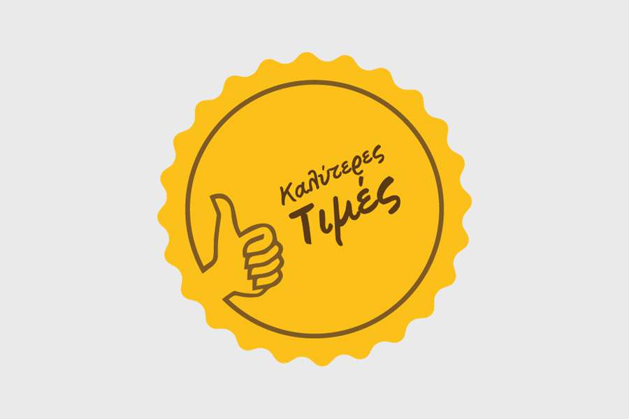 Αυτοκόλλητο βιτρίνας από βινύλιο που απεικονίζει ένα κίτρινο αυτοκόλλητο με μπορντούρα από μια καφέ γραμμή και τη φράση "Καλύτερες Τιμές" με καφέ γράμματα.