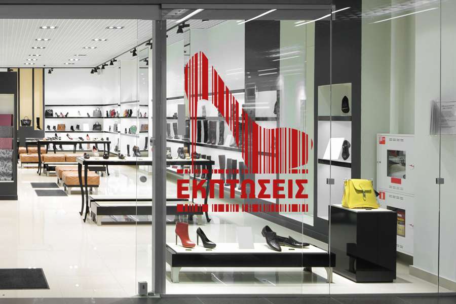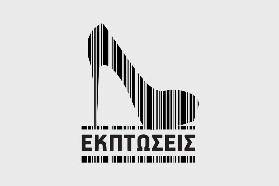 Αυτοκόλλητο βιτρίνας από βινύλιο που απεικονίζει γραμμές από ένα barcode που σχηματίζει μια γόβα και τη λέξη "ΕΚΠΤΩΣΕΙΣ" στο κάτω μέρος του.