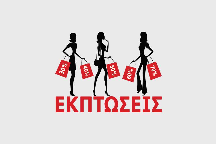 Αυτοκόλλητο βιτρίνας από βινύλιο που απεικονίζει τρεις κοπέλες που βαστάνε κόκκινες τσάντες καταστήματος με μαύρο κορδόνι που γράφουν διάφορα ποσοστά εκπτώσεων και με τη λέξη "ΕΚΠΤΩΣΕΙΣ" στο κάτω μέρος με κόκκινα γράμματα.