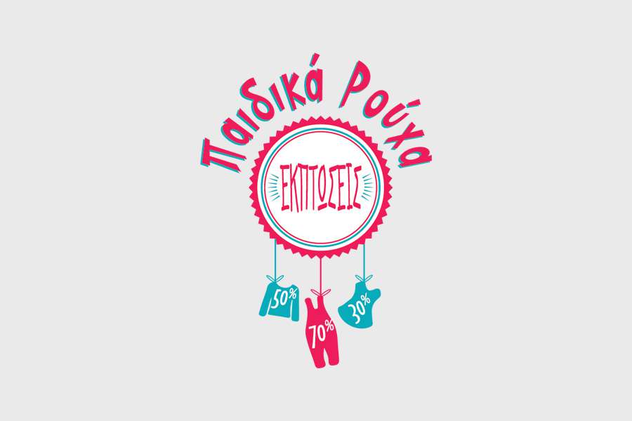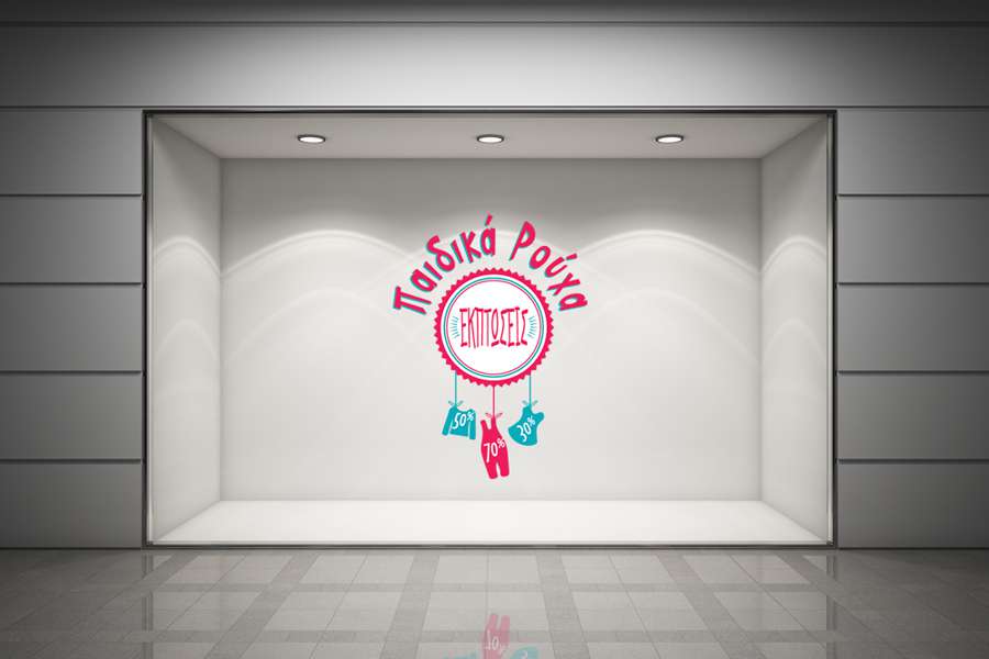 Αυτοκόλλητο βιτρίνας από βινύλιο που απεικονίζει σύνθεση με τη φράση "Παιδικά Ρούχα" γύρω από έναν κύκλο με μπορντούρα που μέσα γράφει "ΕΚΠΤΩΣΕΙΣ", ενώ κάτω από τον κύκλο κρέμονται παιδιά ρούχα με διάφορα ποσοστά εκπτώσεων.