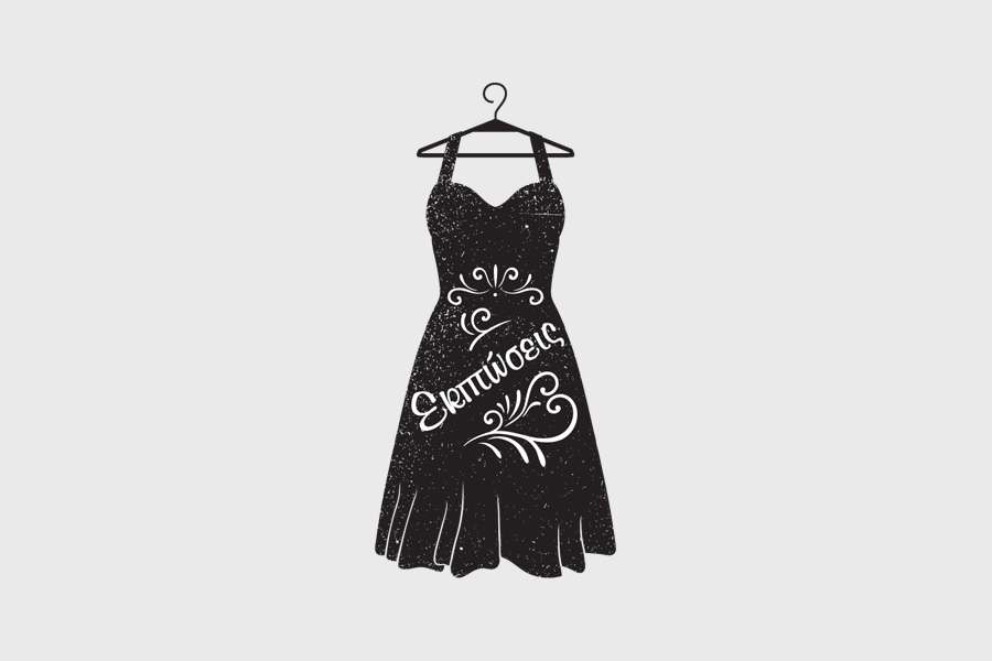 Αυτοκόλλητο βιτρίνας από βινύλιο που απεικονίζει ένα μαύρο φόρεμα σε κρεμάστρα. Το φόρεμα έχει άσπρα σημάδια και σχέδια ενώ στη μέση έχει τη λέξη "Εκπτώσεις"
