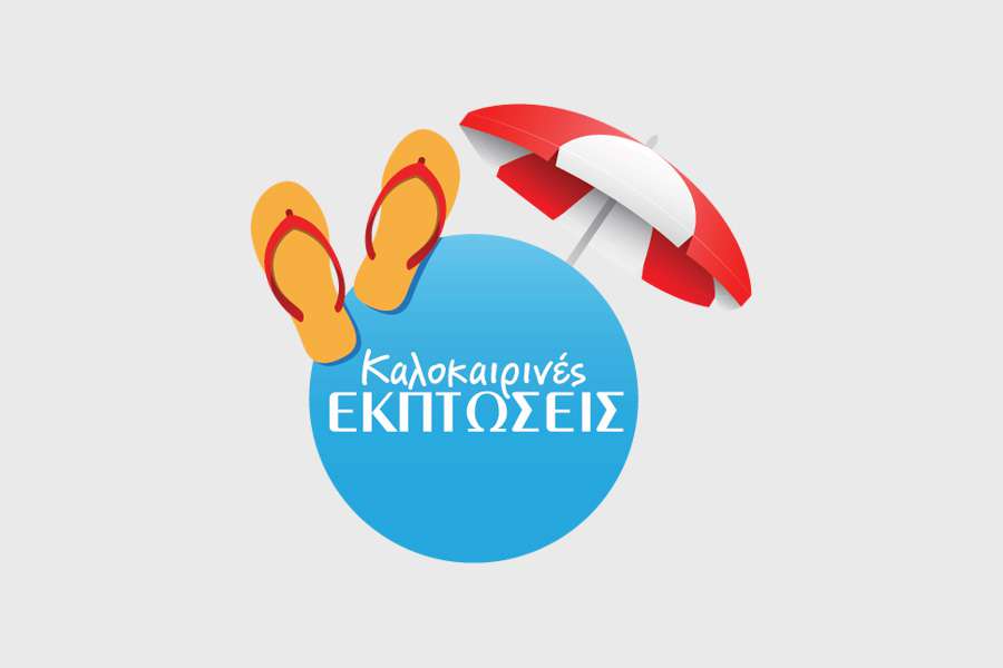 Αυτοκόλλητο βιτρίνας από βινύλιο που απεικονίζει ένα γαλάζιο κύκλο με τη φράση "Καλοκαιρινές ΕΚΠΤΩΣΕΙΣ" με λευκά γράμματα. Στη μια πλευρά έχει ένα ζευγάρι σαγιονάρες και από την άλλη μια κόκκινη με άσπρο, ομπρέλα παραίας.