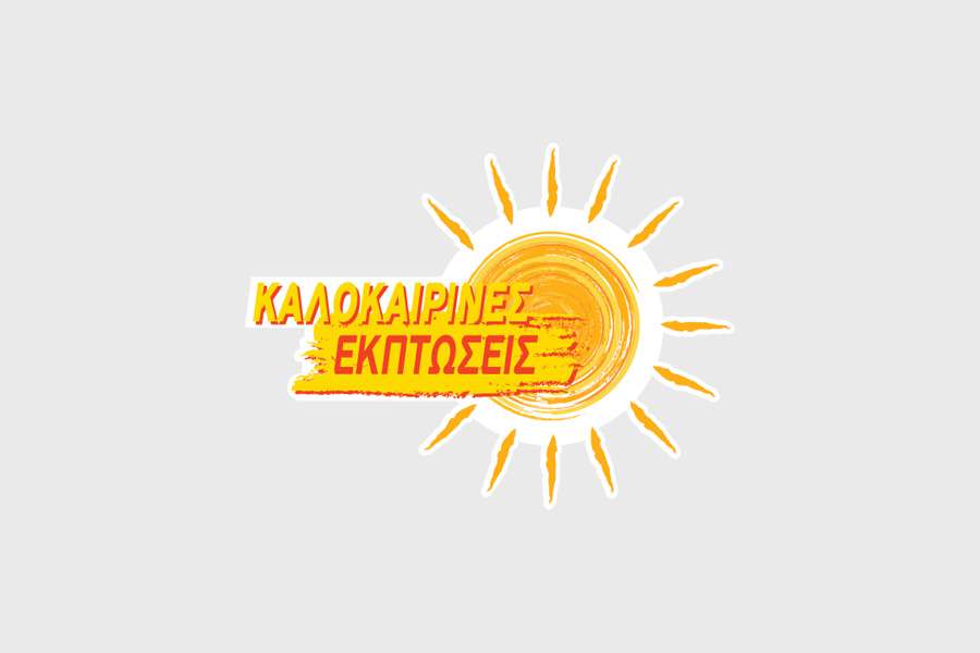 Αυτοκόλλητο βιτρίνας από βινύλιο που απεικονίζει έναν ήλιο με ακτίνες και τη φράση "ΚΑΛΟΚΑΙΡΙΝΕΣ ΕΚΠΤΩΣΕΙΣ" και όλα μαζί σε λευκό περίγραμμα.