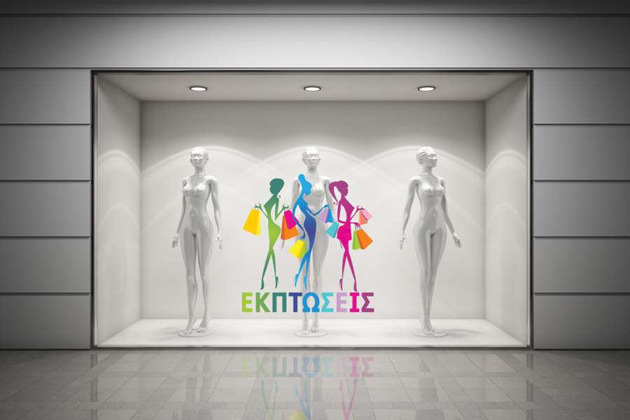 Αυτοκόλλητο βιτρίνας από βινύλιο που απεικονίζει τρείς κοπέλες με τσάντες καταστημάτων και τη λέξη "ΕΚΠΤΩΣΕΙΣ" στο κάτω μέρος και όλο μαζί σε διάφορα φωτεινά χρώματα.