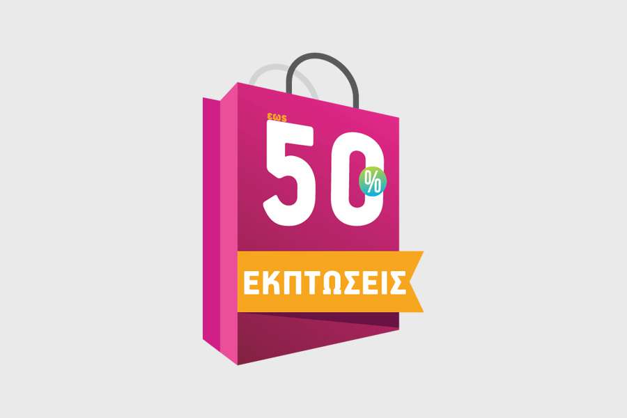Αυτοκόλλητο βιτρίνας από βινύλιο που απεικονίζει μια μοβ τσάντα καταστήματος με κορδόνι που γράφει πάνω ποσοστό έκπτωσης με λευκά γράμματα και τη λέξη "εως" από πάνω του. Στο κάτω μέρος έχει ένα banner σε κίτρινο χρώμα και τη λέξη "ΕΚΠΤΩΣΕΙΣ" σε λευκό χρώμα.