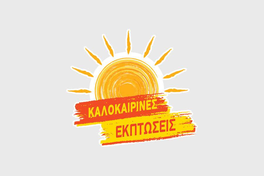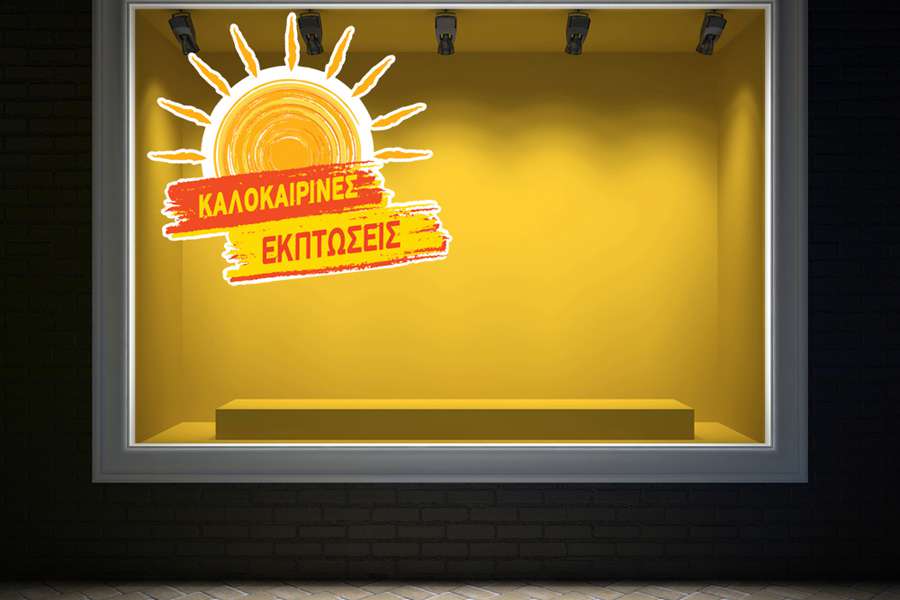 Αυτοκόλλητο βιτρίνας από βινύλιο που απεικονίζει έναν ήλιο με ακτίνες και τη φράση "ΚΑΛΟΚΑΙΡΙΝΕΣ ΕΚΠΤΩΣΕΙΣ" και όλα μαζί σε λευκό περίγραμμα.
