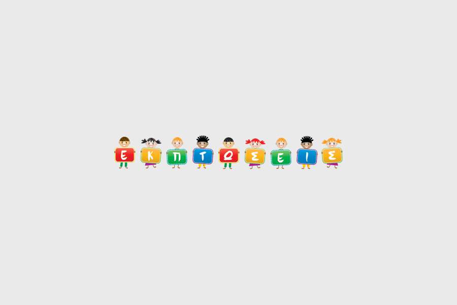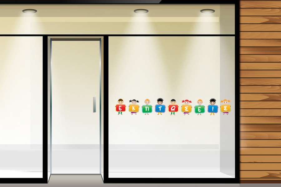 Αυτοκόλλητο βιτρίνας από βινύλιο που απεικονίζει τέσσερα παιδάκια που κρατάνε πινακίδες που μέσα τους κάθε μια έχει ένα γράμμα από τη λέξη "ΕΚΠΤΩΣΕΙΣ".