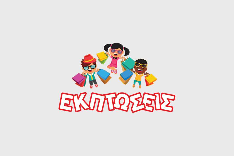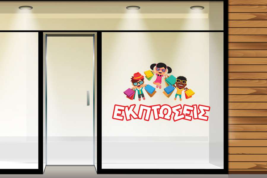 Αυτοκόλλητο βιτρίνας από βινύλιο που απεικονίζει τρία παιδάκια που κρατάνε τσάντες καταστημάτων πάνω από τη λέξη "ΕΚΠΤΩΣΕΙΣ" σε λευκό χρώμα με κόκκινο περίγραμμα.
